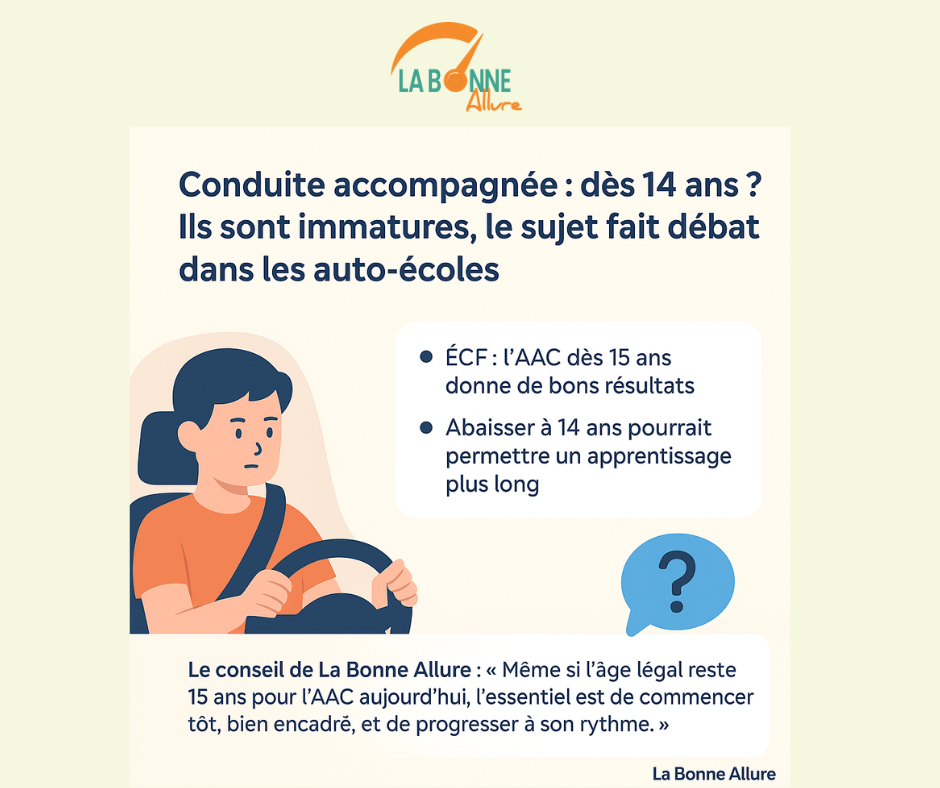 Le débat est lancé : certains professionnels de la conduite plaident pour ouvrir la voie de la Conduite Accompagnée (AAC) dès 14 ans, au lieu de 15 ans actuellement. La question : les adolescents sont‐ils assez mûrs ? Ou serait‐ce une vraie opportunité pour renforcer l’apprentissage ?